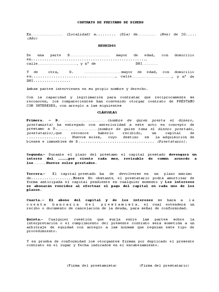Ejemplo De Contrato De Prestamo De Dinero. Modelo De Contrato De Prestamo De Dinero Entre Particulares