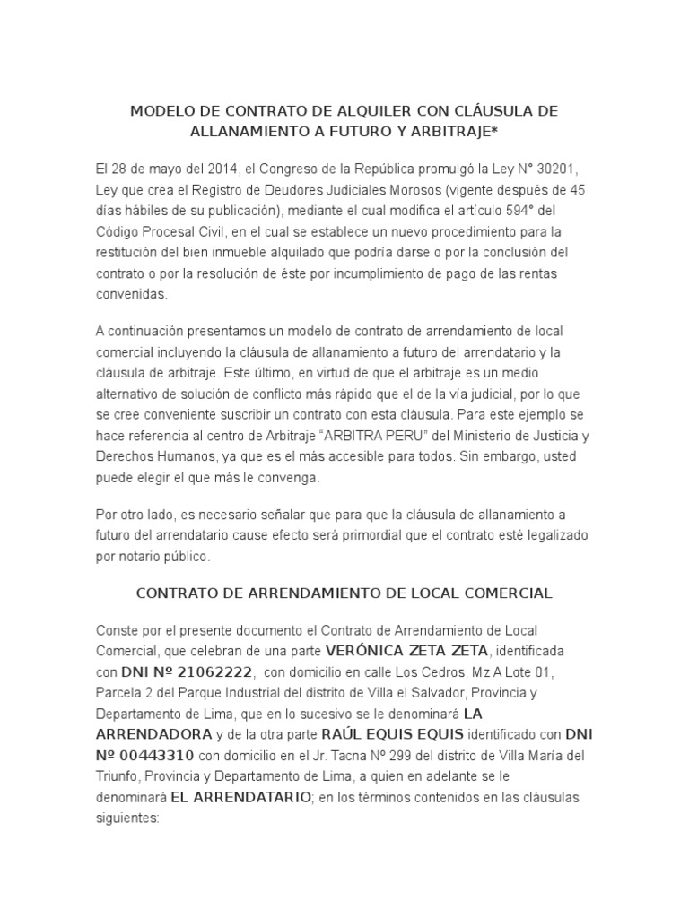 Modelo De Contrato De Alquiler Con Cláusula De Allanamiento