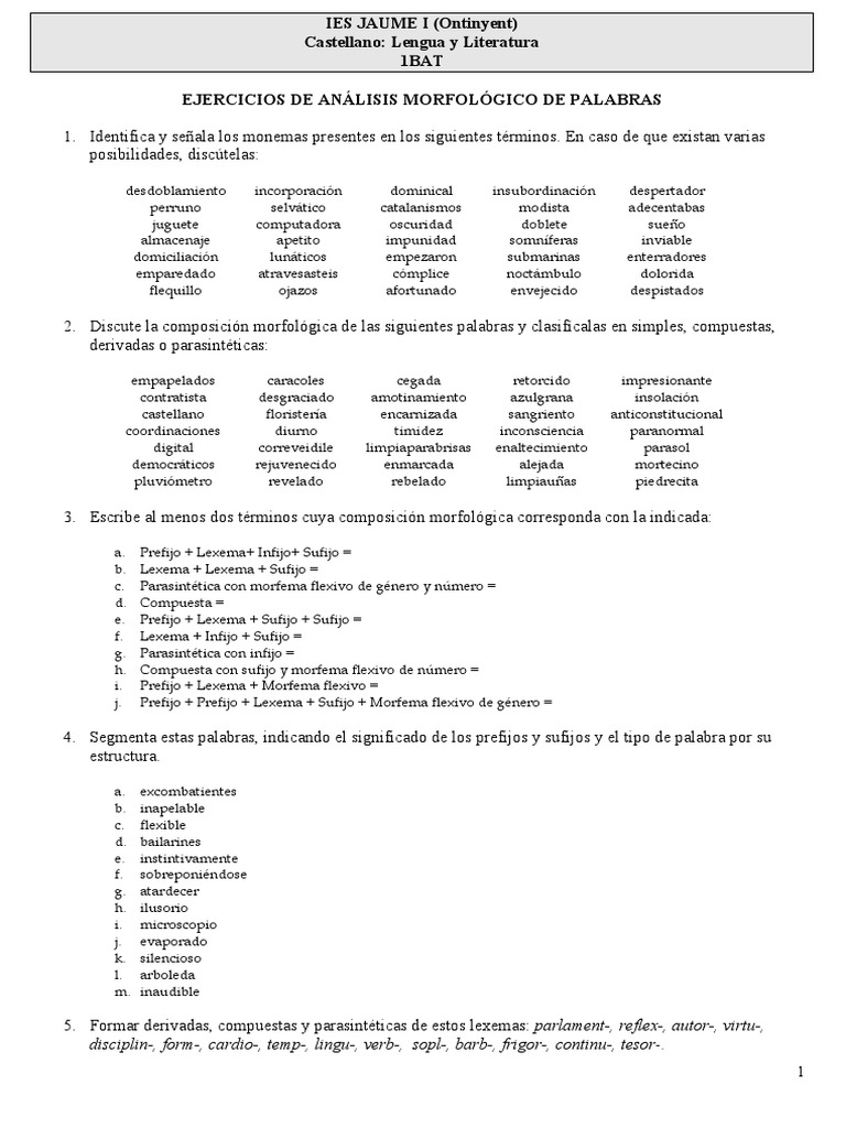Ejercicios De Palabras Simples Derivadas Compuestas Y