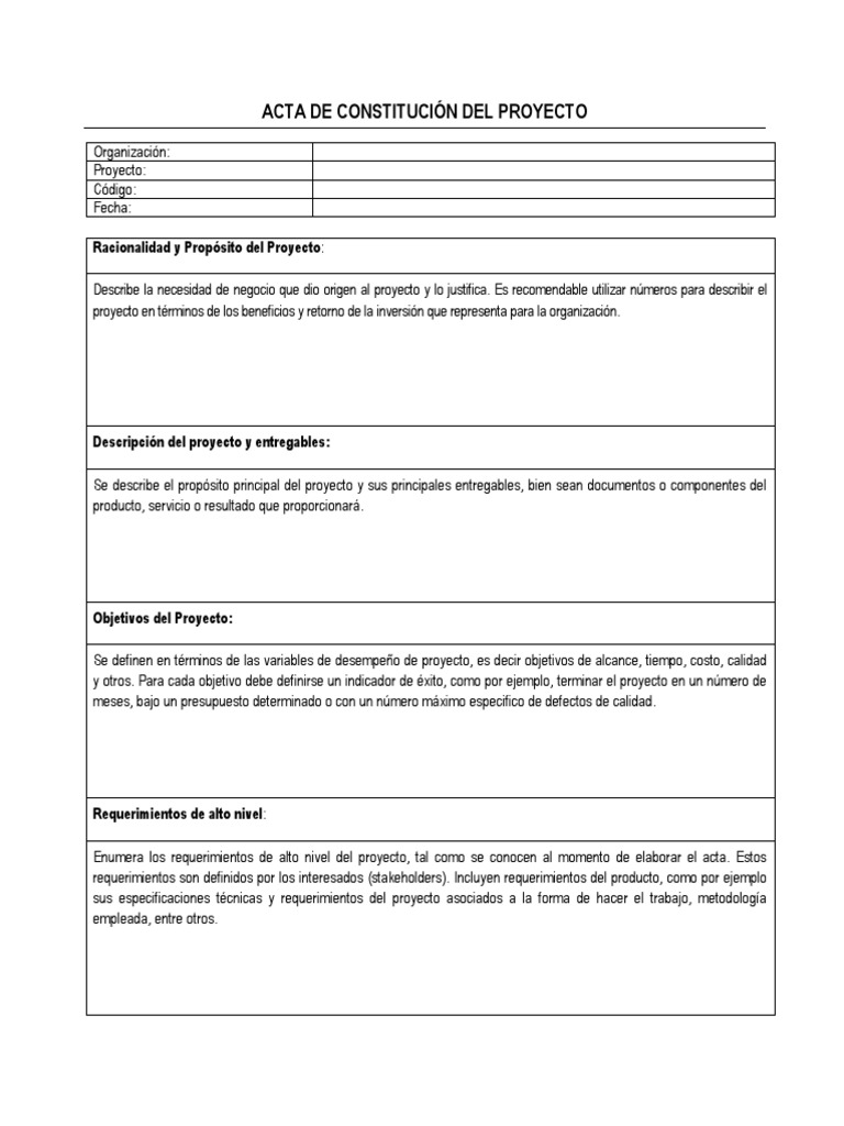 Ejemplo De Una Acta De Constitucion De Un Proyecto
